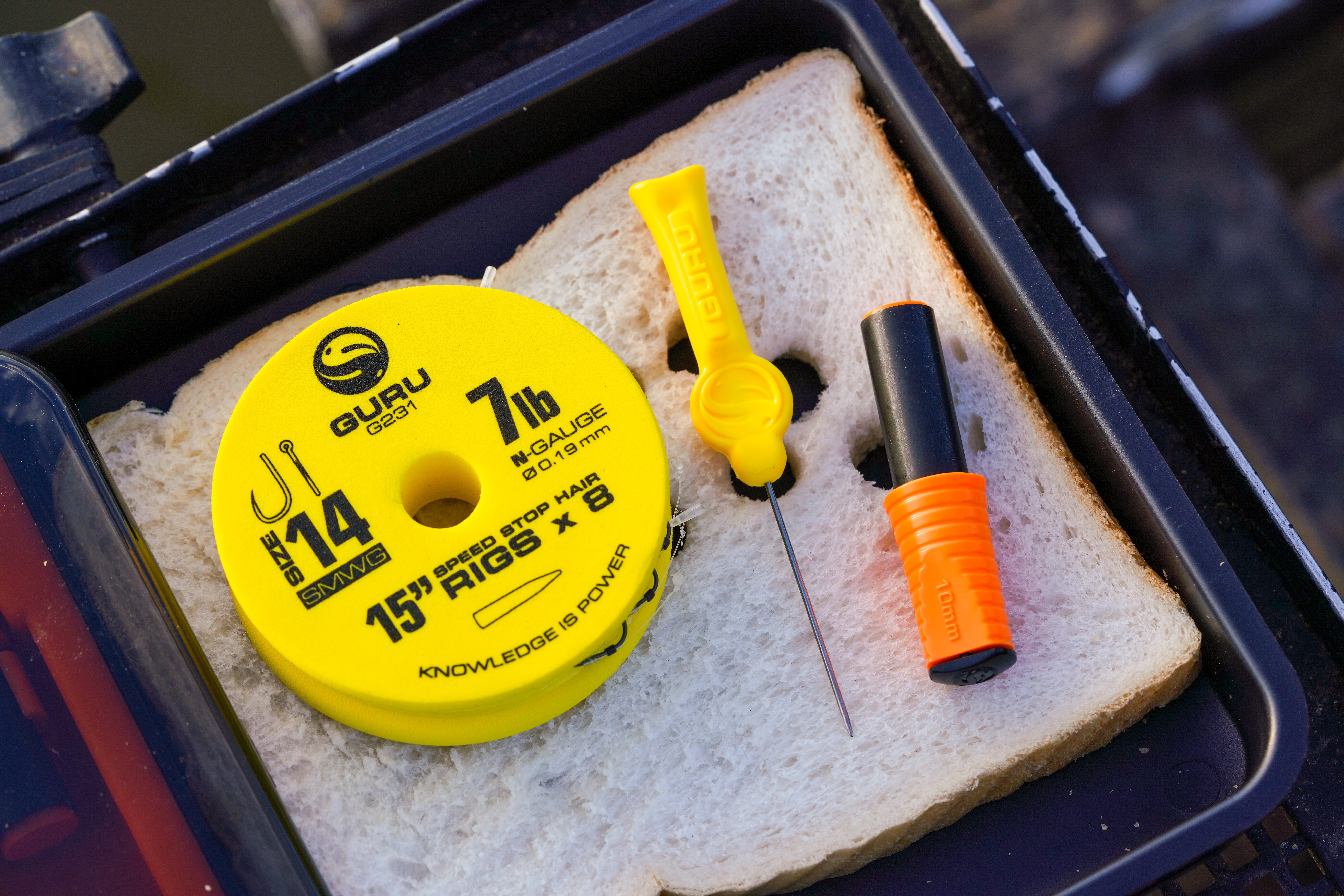 Hook choice has to be a SMWG in neither a 16 or a 14. This is a hook I have ultimate confidence in, and I feel you get brilliant hook holds. This will be attached to a N-Gauge hooklength in either 0.15, 0.17 or 0.19mm depending on the size of fish I’m targeting. If you struggle to tie hair rigs the Guru SMWG 15” Speed Stop Read rigs are perfectly suited for Bomb and Bread